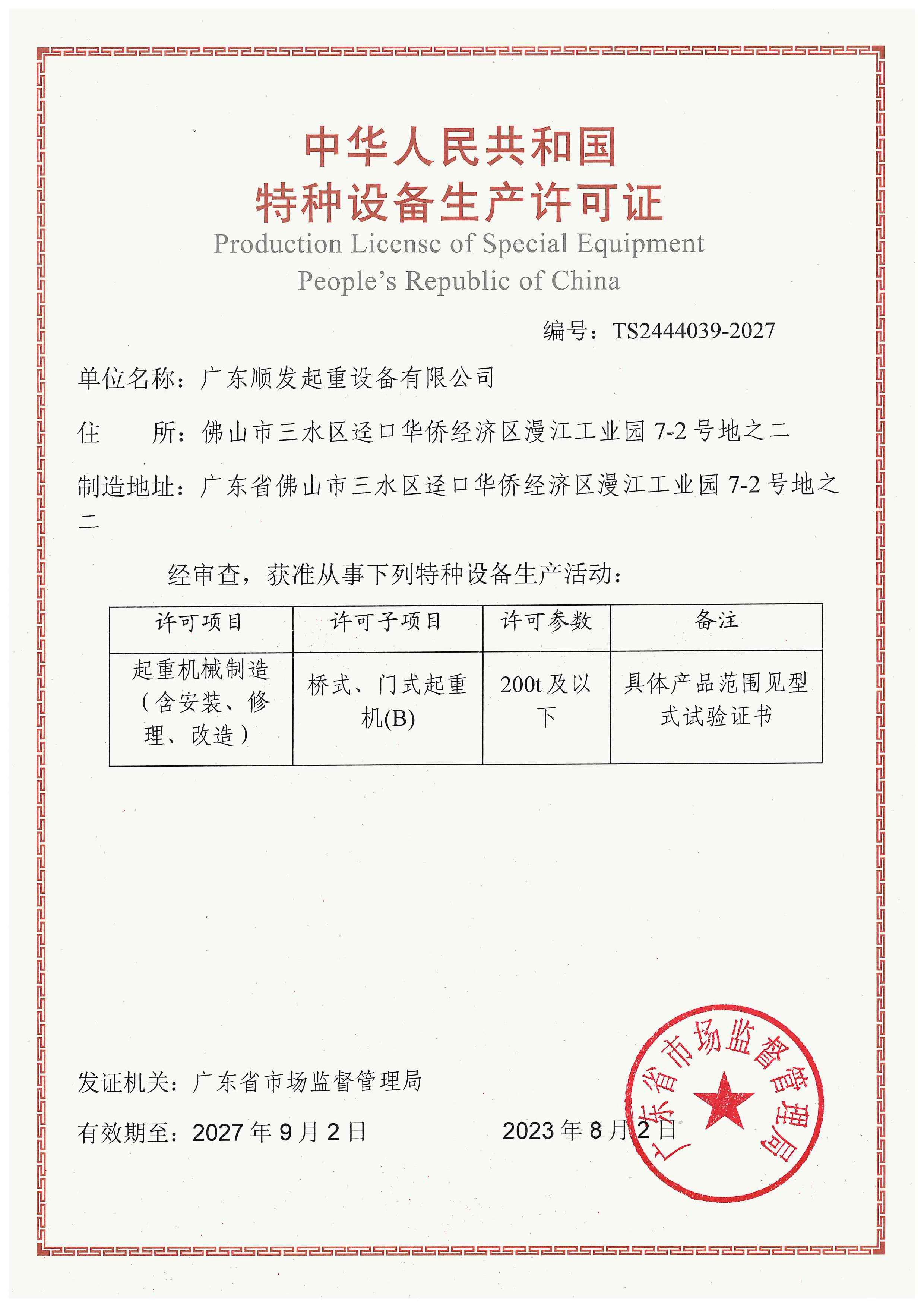 特種設(shè)備(起重機(jī))制造許可證